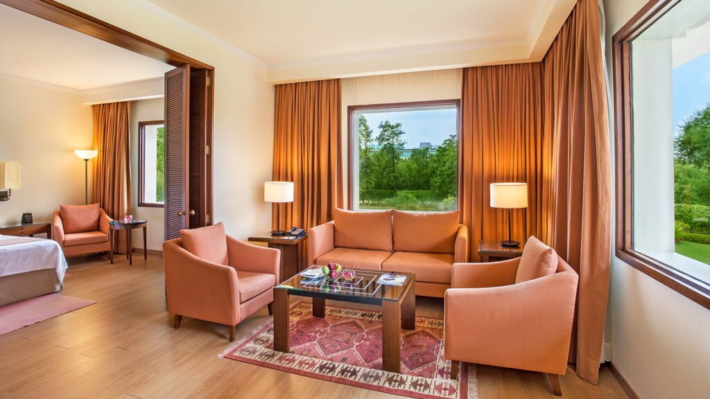 a prestigious 5-star luxury hotel in Delhi, blending elegant Lutyens-inspired design with modern comfort, overlooking Humayun’s Tomb and Delhi Golf Club.