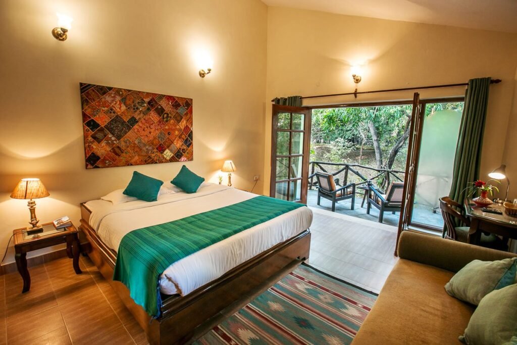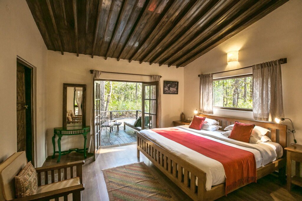 The charming cottages in Kanha Jungle Lodge are elegant with architecture that blends the village architecture with a contemporary feel.